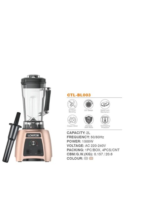 The Lontor Heavy Duty Blender/Ice Crusher (CTL-BL003) is a high power ice and dry speed crusher with a 1500W motor, a 2L capacity and a 220V 50/60Hz frequency. It is easy to use, clean and has low noise operation.